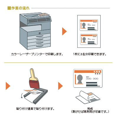 カラーページプリンタで印刷ができ、ICカード等に貼り付けが可能です。