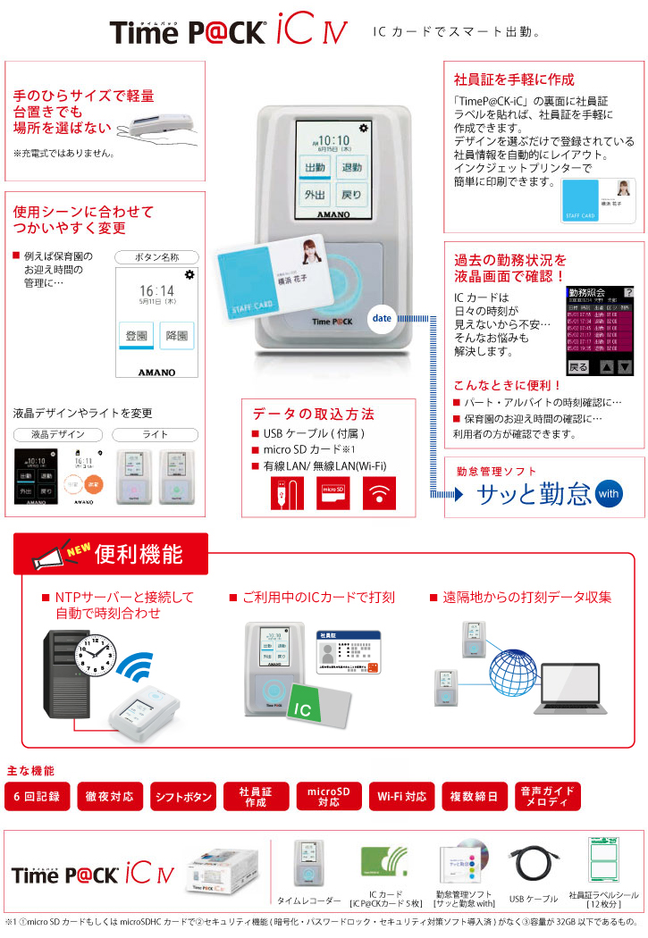 商品内容:本体、勤怠管理ソフト「サッと勤怠with」、専用ICカード5枚、社員証ラベルシール12枚分、USBケーブル| 打刻回数 | 1日6回 | ||