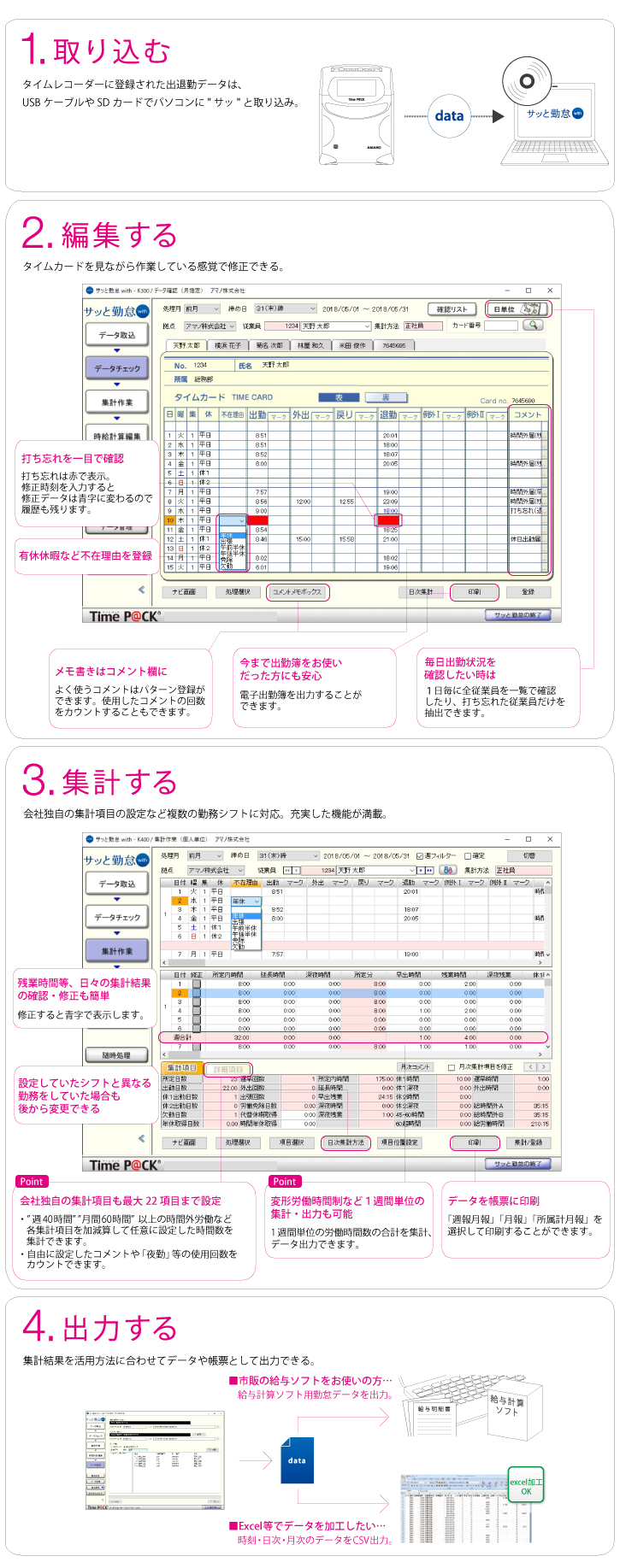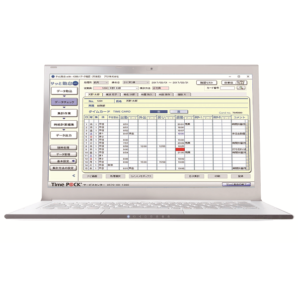 打ち間違いや打ち忘れの修正は、パソコンでらくらく!集計データは、CSV形式や市販給与ソフト(給与ソフト連携一覧)へ出力ができます。週報月報や出勤簿などの帳票類も簡単に出力可能です。