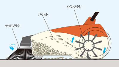 サイドブラシが隅やコーナーのゴミ・ほこりをメインブラシ部まで運び、メインブラシがバケットに掃き入れます。2コンパクト設計