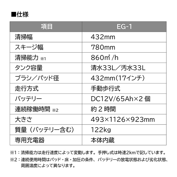 | 走行方式 | 手動歩行式 | 連続稼働時間 | 約2時間 ※1 |