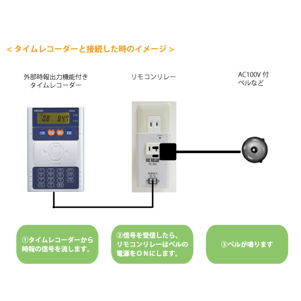 また、リモコンリレー自体で時間の制御はできません。別途外部時報出力機能を備えたタイムレコーダーやタイマーなど時間を制御する機器が必要です。