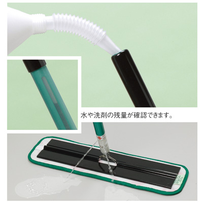 洗剤をまきながらモップ掛け。ハンドル内に水や洗剤を注入し、必要時にハンドル上部のボタンを押すことで床面に放出させながらの清掃が可能です。