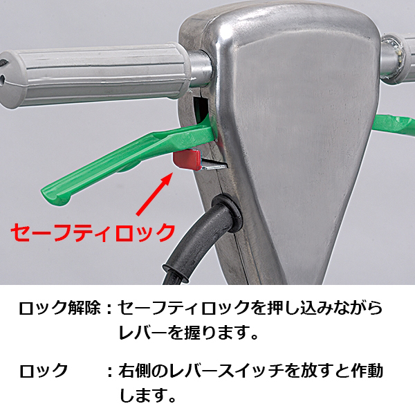 プラグをコンセントに差し込んでも、レバースイッチを操作しない限り、始動しません。 セーフティーロックは、右側のレバーを離すと作動します。