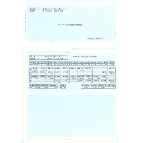A4サイズの用紙に印刷後、専用機にて三つ折りの形状に折りたたみ、圧着させて給与明細書を作成します。