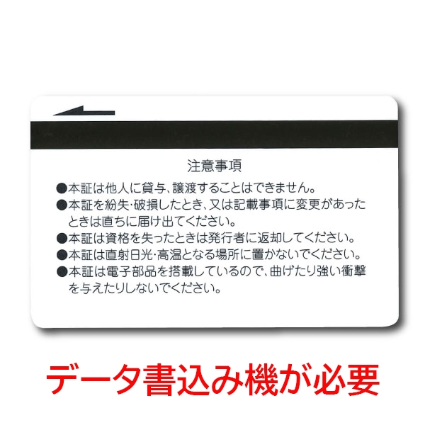 裏面磁気ストライプ付き、注意文印刷済みカードです。